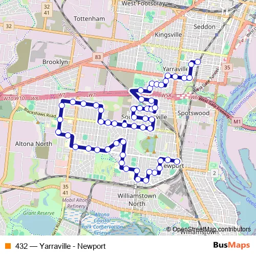 The first stop of the 432 bus route is Newport Interchange/Mason St and the last stop is Yarraville Station/Birmingham St. 432 (Yarraville - Newport) is operational during everyday.