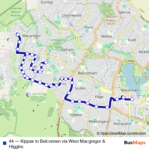 The first stop of the 44 bus route is Kippax Interchange and the last stop is Belconnen Interchange Arrivals. 44 (Kippax to Belconnen via West Macgregor & Higgins) is operational during everyday.