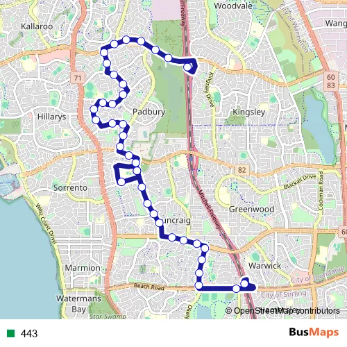 The first stop of the 443 bus route is Warwick Stn Stand 4 and the last stop is Whitfords Stn Stand 4. 443 is operational during everyday.