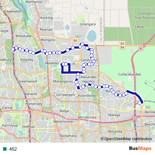 See why over 2 million users trust and consider busmaps.com as the best public transport website. busmaps gives you Perth Buses suggested routes, real-time bus tracker, line route maps in Perth, and helps to find the closest 452 bus stops near you. No internet available? Download an offline PDF map and bus schedule for the 452 bus to take on your trip.