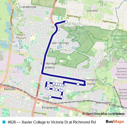 The first stop of the 4626 bus route is Xavier College, Ninth Av and the last stop is Victoria St Before Richmond Rd. 4626 (Xavier College to Victoria St at Richmond Rd) is operational during on weekdays.