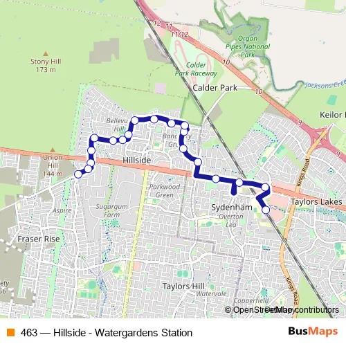 The first stop of the 463 bus route is Watergardens Station/Watergardens Circuit Rd and the last stop is Sanctuary Rd/Beattys Rd. 463 (Hillside - Watergardens Station) is operational during everyday.