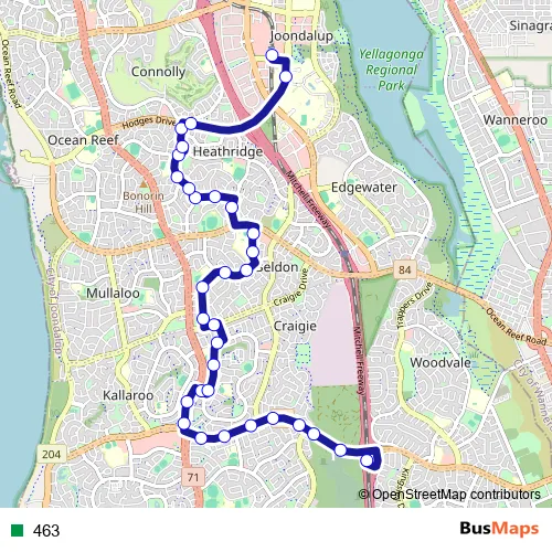 The first stop of the 463 bus route is Whitfords Stn Stand 4 and the last stop is Joondalup Stn Stand 1. 463 is operational during everyday.