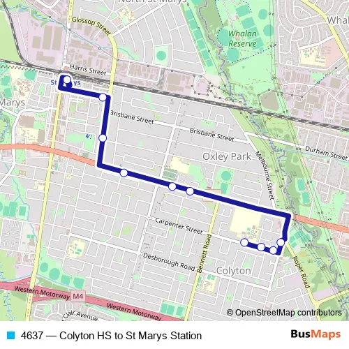 The first stop of the 4637 bus route is Colyton High School, Carpenter St and the last stop is St Marys Station, Stand B. 4637 (Colyton HS to St Marys Station) is operational during on weekdays.