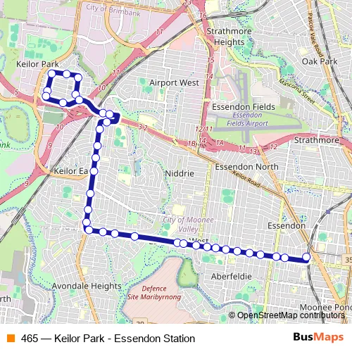 The first stop of the 465 bus route is Swan St/Erebus St and the last stop is Essendon Station/Rose St. 465 (Keilor Park - Essendon Station) is operational during everyday.