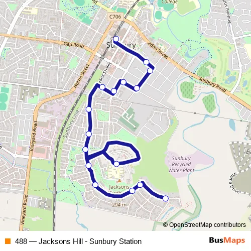 The first stop of the 488 bus route is Jacksons Hill Terminus/The Strand and the last stop is Sunbury Station/Brook St. 488 (Jacksons Hill - Sunbury Station) is operational during everyday.