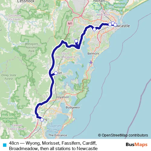 Click here to view the nearest 48cn - Wyong, Morisset, Fassifern, Cardiff, Broadmeadow, then all stations to Newcastle bus stop.