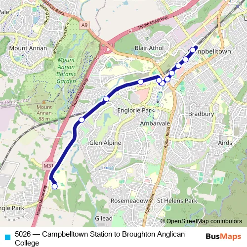 The first stop of the 5026 bus route is Campbelltown Station, Stand D and the last stop is Broughton Anglican College, Senior Learning Centre. 5026 (Campbelltown Station to Broughton Anglican College) is operational during on weekdays.
