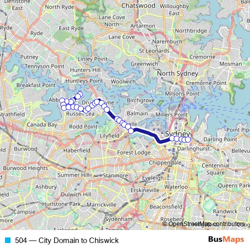 The first stop of the 504 bus route is Chiswick Shops, Blackwall Point Rd and the last stop is Riley St Opp Kennedy St. 504 (City Domain to Chiswick) is operational during everyday.