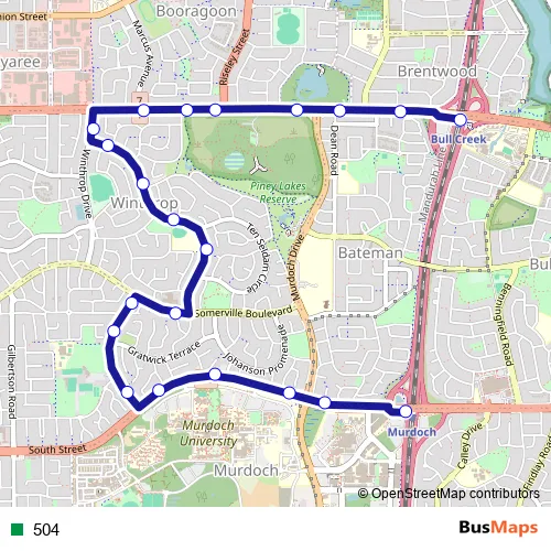 The first stop of the 504 bus route is Bull Creek Stn Stand 4 and the last stop is Murdoch Stn Stand 12. 504 is operational during on weekdays.