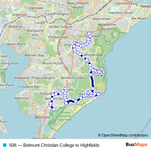 The first stop of the 508 bus route is Belmont Christian College, John Fisher Rd and the last stop is Kahibah Rd Opp Highfields Pde. 508 (Belmont Christian College to Highfields) is operational during on weekdays.