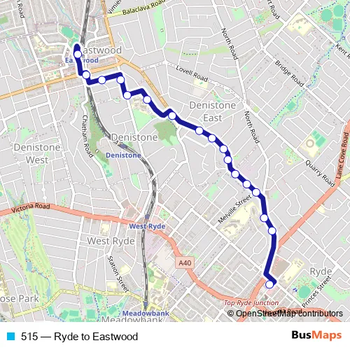 The first stop of the 515 bus route is Top Ryde Shops, Church St and the last stop is Eastwood Station, West Pde, Stand A. 515 (Ryde to Eastwood) is operational during everyday.