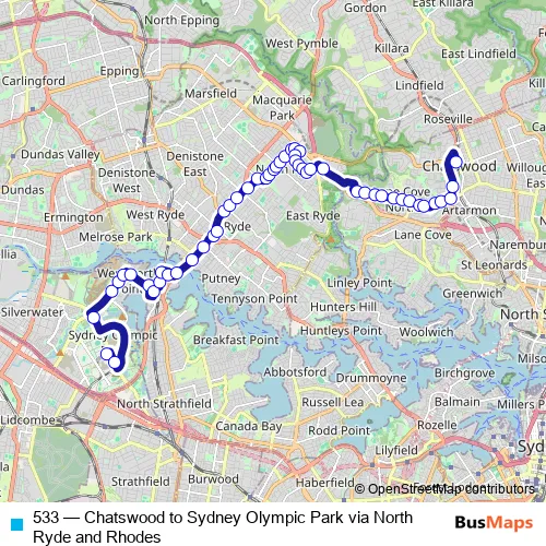 Bus 533 - Chatswood to Sydney Olympic Park via North Ryde and Rhodes: Full Schedule in Sydney