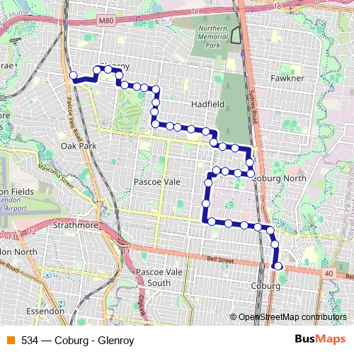 The first stop of the 534 bus route is Coburg PS/Bell St and the last stop is Glenroy Station/Hartington St. 534 (Coburg - Glenroy) is operational during everyday.