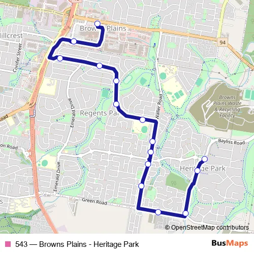 The first stop of the 543 bus route is Bayliss Rd near Hawthorn St and the last stop is Browns Plains station, stop 1a. 543 (Browns Plains - Heritage Park) is operational during on weekdays.