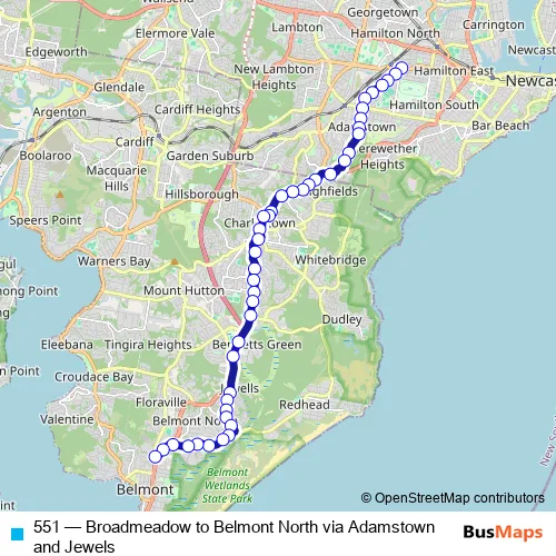 The first stop of the 551 bus route is Belford St Before Chatham St and the last stop is Belmont Bus Depot, Floraville Rd. 551 (Broadmeadow to Belmont North via Adamstown and Jewels) is operational during on weekdays.