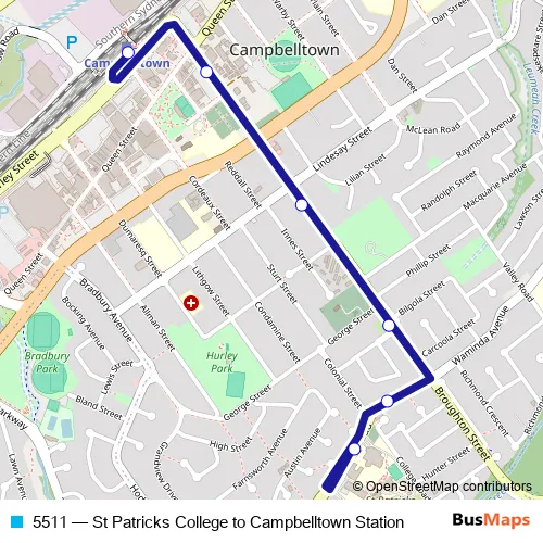 The first stop of the 5511 bus route is St Patrick's College, St Johns Rd and the last stop is Campbelltown Station, Stand C. 5511 (St Patricks College to Campbelltown Station) is operational during on weekdays.