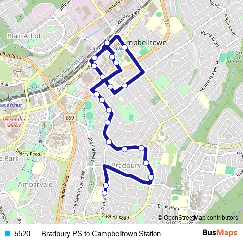 The first stop of the 5520 bus route is Bradbury Public School, Jacaranda Av and the last stop is Campbelltown Station, Stand C. 5520 (Bradbury PS to Campbelltown Station) is operational during on weekdays.