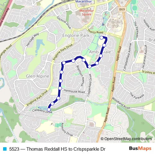 The first stop of the 5523 bus route is Thomas Reddall Hs and the last stop is Cleopatra Reserve, Crispsarkle Dr. 5523 (Thomas Reddall HS to Crispsparkle Dr) is operational during on weekdays.
