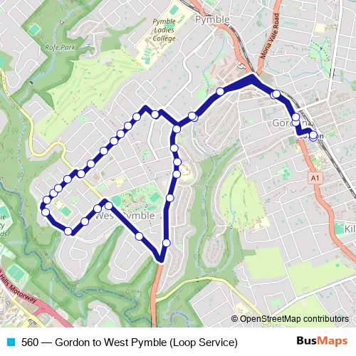 The first stop of the 560 bus route is Gordon Station, Stand B and the last stop is Gordon Station, Stand C. 560 (Gordon to West Pymble (Loop Service)) is operational during everyday.