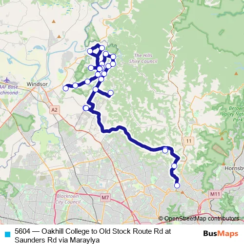 The first stop of the 5604 bus route is Oakhill College, Old Northern Rd and the last stop is Old Stock Route Rd Before Saunders Rd. 5604 (Oakhill College to Old Stock Route Rd at Saunders Rd via Maraylya) is operational during on weekdays.