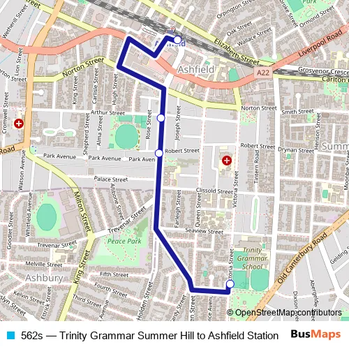 The first stop of the 562s bus route is Trinity Grammar School, Victoria St and the last stop is Ashfield Station, Brown St, Stand A. 562s (Trinity Grammar Summer Hill to Ashfield Station) is operational during on weekdays.