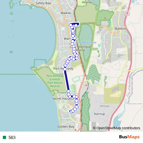 The first stop of the 563 bus route is Bluestone Pwy Comet Bay College Stand 3 and the last stop is Warnbro Stn Stand 7. 563 is operational during everyday.