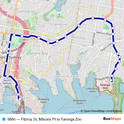 The first stop of the 568n bus route is Fitzroy St At Alfred St and the last stop is Taronga Zoo, Bradleys Head Rd. 568n (Fitzroy St, Milsons Pt to Taronga Zoo) is operational during on weekdays.