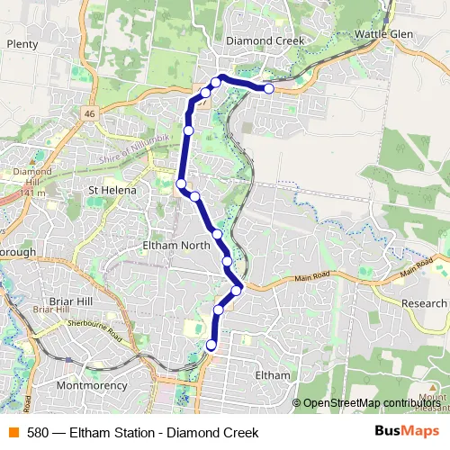 The first stop of the 580 bus route is Diamond Creek Plaza/Main Hurstbridge Rd and the last stop is Eltham Station/Main Rd. 580 (Eltham Station - Diamond Creek) is operational during everyday.