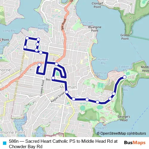 The first stop of the 586n bus route is Cardinal St Opp Sacred Heart Primary School and the last stop is Balmoral Naval Hospital, Middle Head Rd. 586n (Sacred Heart Catholic PS to Middle Head Rd at Chowder Bay Rd) is operational during on weekdays.