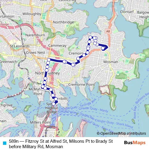 Bus 589n - Fitzroy St at Alfred St, Milsons Pt to Brady St before Military Rd, Mosman: Full Schedule in Sydney
