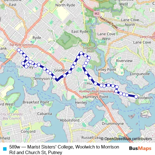 Bus 589w - Marist Sisters' College, Woolwich to Morrison Rd and Church St, Putney in Sydney: Stops & Timetable