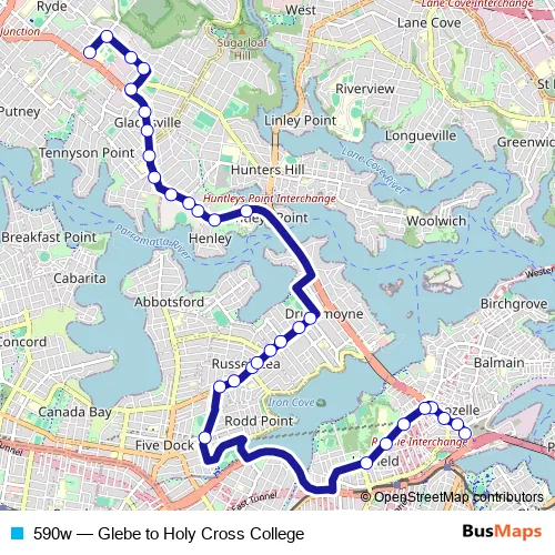 The first stop of the 590w bus route is Victoria Rd Opp White Bay and the last stop is Holy Cross College, Cressy Rd. 590w (Glebe to Holy Cross College) is operational during on weekdays.