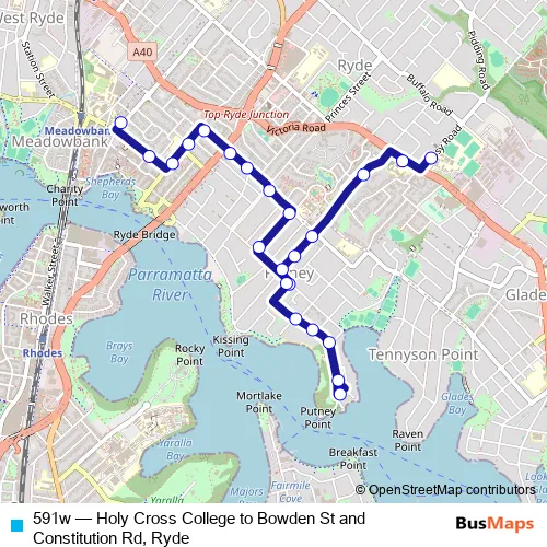 The first stop of the 591w bus route is Holy Cross College, Cressy Rd and the last stop is Bowden St After Constitution Rd. 591w (Holy Cross College to Bowden St and Constitution Rd, Ryde) is operational during on weekdays.