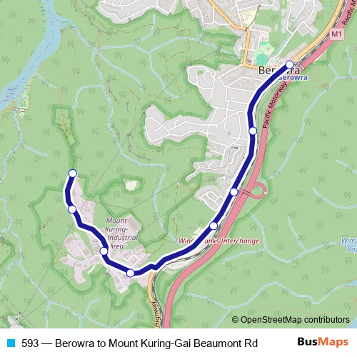 The first stop of the 593 bus route is Berowra Station, Pacific Hwy and the last stop is Beaumont Rd Turnaround. 593 (Berowra to Mount Kuring-Gai Beaumont Rd) is operational during on weekdays.