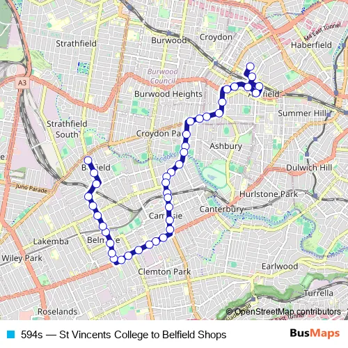The first stop of the 594s bus route is St Vincents College Ashfield, Alt St and the last stop is Belfield Shops, Burwood Rd. 594s (St Vincents College to Belfield Shops) is operational during on weekdays.