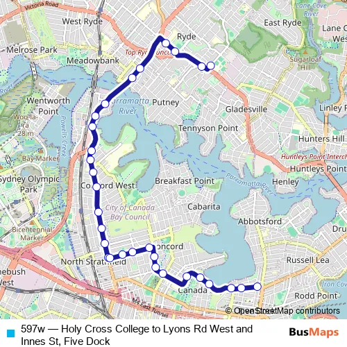 Click here to view the nearest 597w - Holy Cross College to Lyons Rd West and Innes St, Five Dock bus stop.
