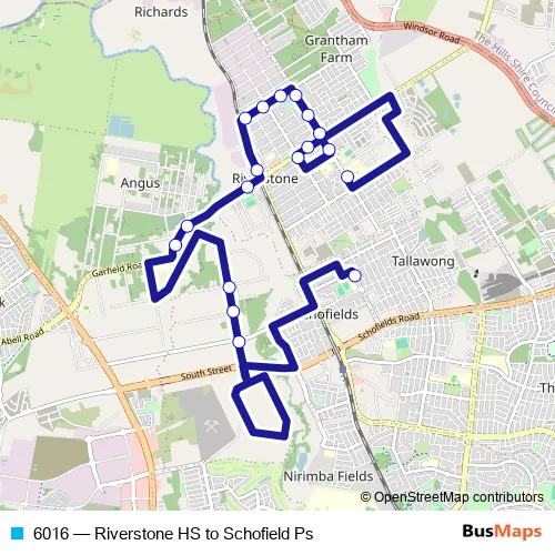 The first stop of the 6016 bus route is Riverstone High School, Mcculloch St and the last stop is Junction Rd Opp Schofields Public School. 6016 (Riverstone HS to Schofield Ps) is operational during on weekdays.