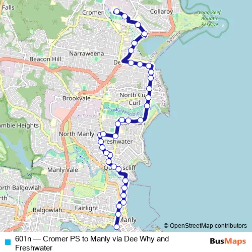 The first stop of the 601n bus route is Manly Wharf, East Esplanade, Stand C and the last stop is Nbsc Cromer Campus, School Grounds, South Creek Rd. 601n (Cromer PS to Manly via Dee Why and Freshwater) is operational during on weekdays.
