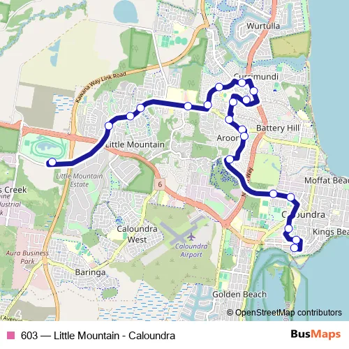 The first stop of the 603 bus route is Parklands Bvd near Village Way and the last stop is Caloundra station. 603 (Little Mountain - Caloundra) is operational during everyday.