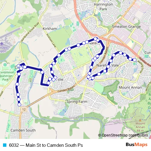 The first stop of the 6032 bus route is Mount Annan District Centre, Main St and the last stop is Camden South Public School, Old Hume Hwy. 6032 (Main St to Camden South Ps) is operational during on weekdays.