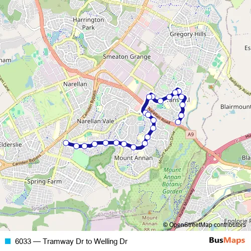 The first stop of the 6033 bus route is Tramway Dr After Narellan Rd and the last stop is Welling Dr Before Richardson Rd. 6033 (Tramway Dr to Welling Dr) is operational during on weekdays.