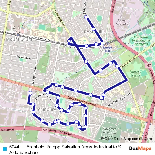 The first stop of the 6044 bus route is Archbold Rd After Great Western Hwy and the last stop is St Aidans Catholic Church, Rooty Hill Rd North. 6044 (Archbold Rd opp Salvation Army Industrial to St Aidans School) is operational during on weekdays.