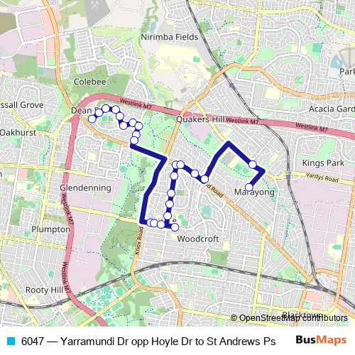 The first stop of the 6047 bus route is Yarramundi Dr Opp Hoyle Dr and the last stop is Breakfast Rd Opp St Andrews Primary School. 6047 (Yarramundi Dr opp Hoyle Dr to St Andrews Ps) is operational during on weekdays.