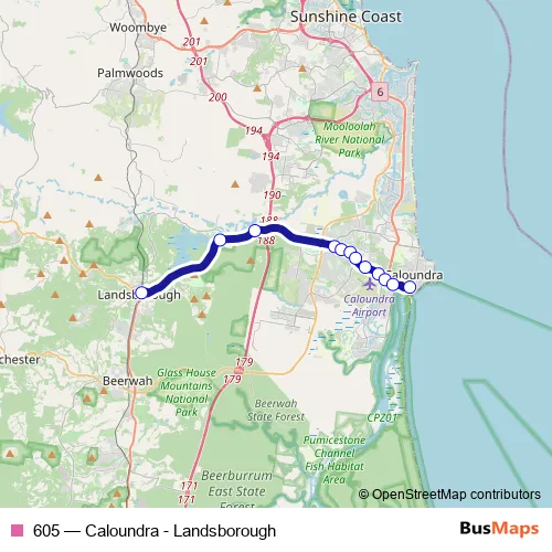 The first stop of the 605 bus route is Landsborough station, stop A and the last stop is Caloundra station. 605 (Caloundra - Landsborough) is operational during everyday.