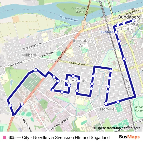 The first stop of the 605 bus route is Woongarra St at City Centre and the last stop is Sugarland Plaza (Terminating Stop). 605 (City - Norville via Svensson Hts and Sugarland) is operational during everyday.