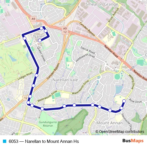 The first stop of the 6053 bus route is Narellan Town Centre, Elyard St and the last stop is Mount Annan High School, Welling Dr. 6053 (Narellan to Mount Annan Hs) is operational during on weekdays.