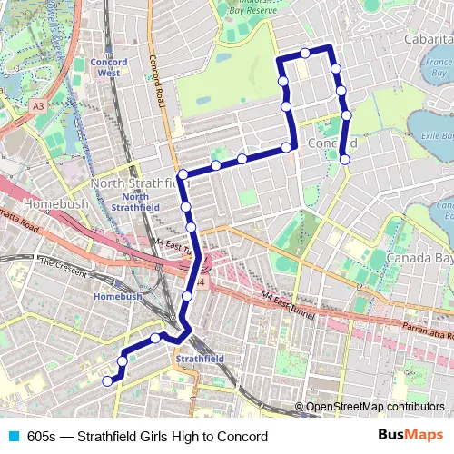Click here to view the nearest 605s - Strathfield Girls High to Concord bus stop.