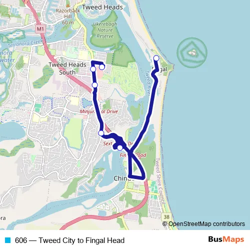 The first stop of the 606 bus route is Fingal Head Public School, Prince St and the last stop is Tweed City Shopping Centre. 606 (Tweed City to Fingal Head) is operational during on weekdays.