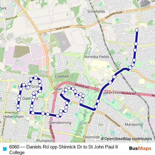 The first stop of the 6060 bus route is Daniels Rd Opp Shinnick Dr and the last stop is St John Paul II College, Hambledon Rd. 6060 (Daniels Rd opp Shinnick Dr to St John Paul II College) is operational during on weekdays.